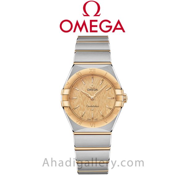 این مدل 28 میلی‌متری طلای زرد 18 عیار و فولاد ضد زنگ دارای قاب حکاکی‌شده با اعداد رومی، صفحه شامپاینی با طرح ابریشم مانند و کریستال یاقوت کبود مقاوم در برابر خش است. عقربه ها، آرم OMEGA، ستاره صورت فلکی و شاخص‌ها نیز از طلای زرد 18 عیار هستند.