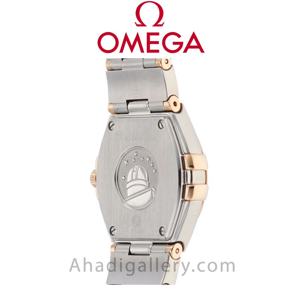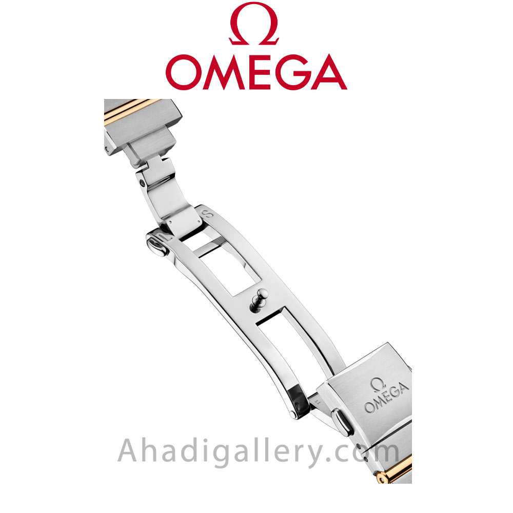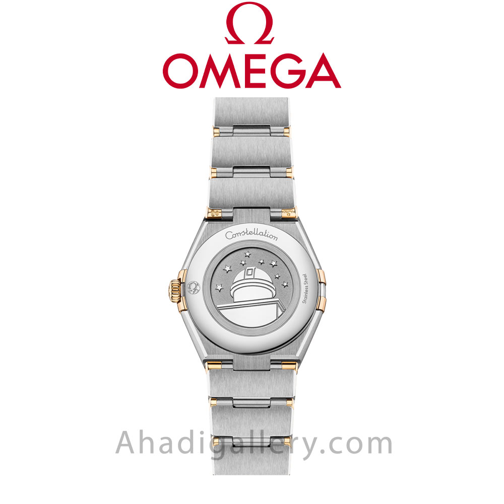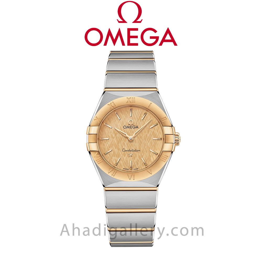 این مدل 28 میلیمتری طلای زرد 18 عیار و فولاد ضد زنگ دارای قاب حکاکیشده با اعداد رومی، صفحه شامپاینی با طرح ابریشم مانند و کریستال یاقوت کبود مقاوم در برابر خش است. عقربه ها، آرم OMEGA، ستاره صورت فلکی و شاخصها نیز از طلای زرد 18 عیار هستند.