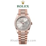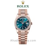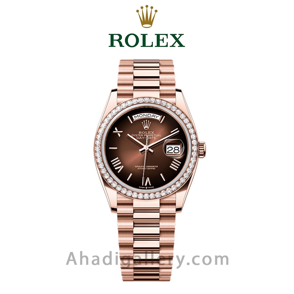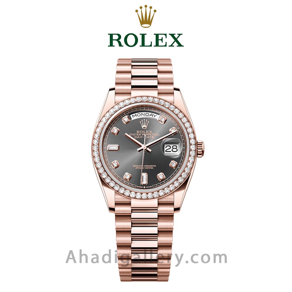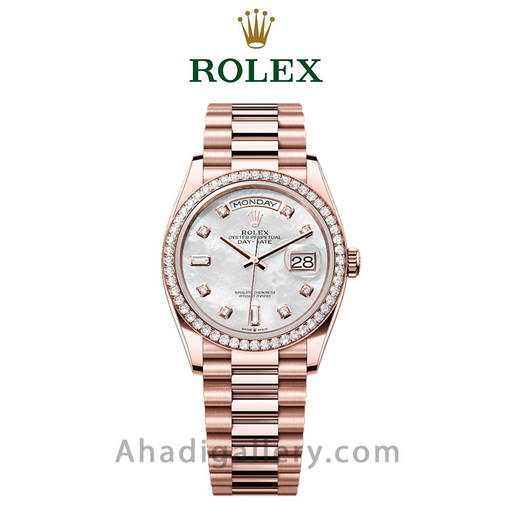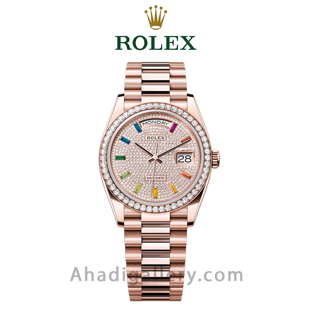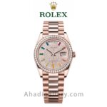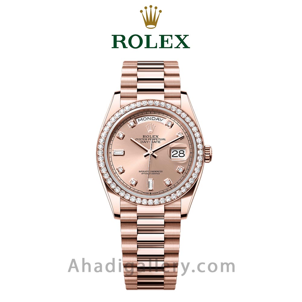 ساعت Lady-Datejust Oyster Perpetual از جنس طلای ِاوررُز ۱۸ عیار با دور قاب الماسنشان و بند پرزیدنت است.