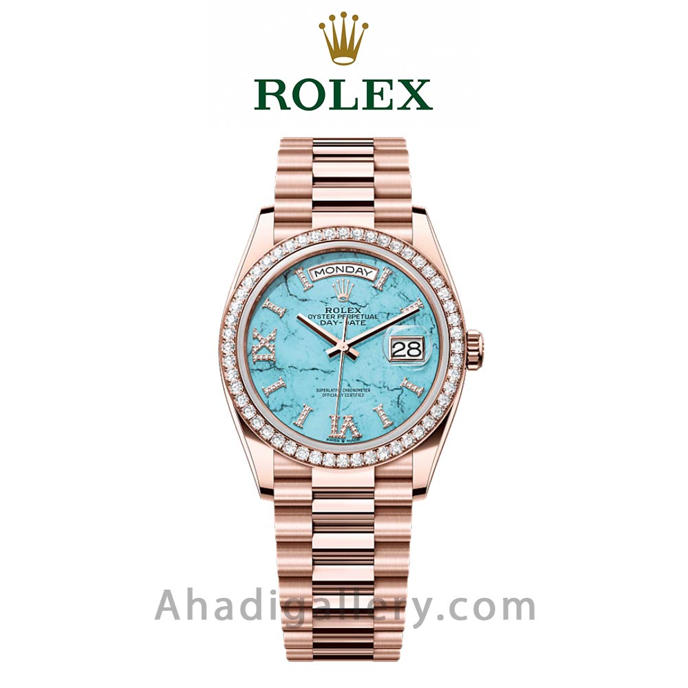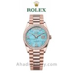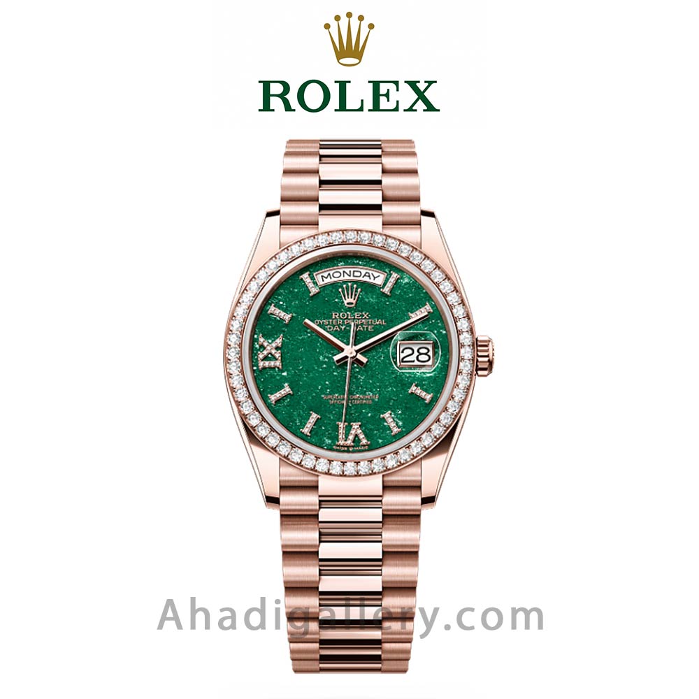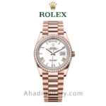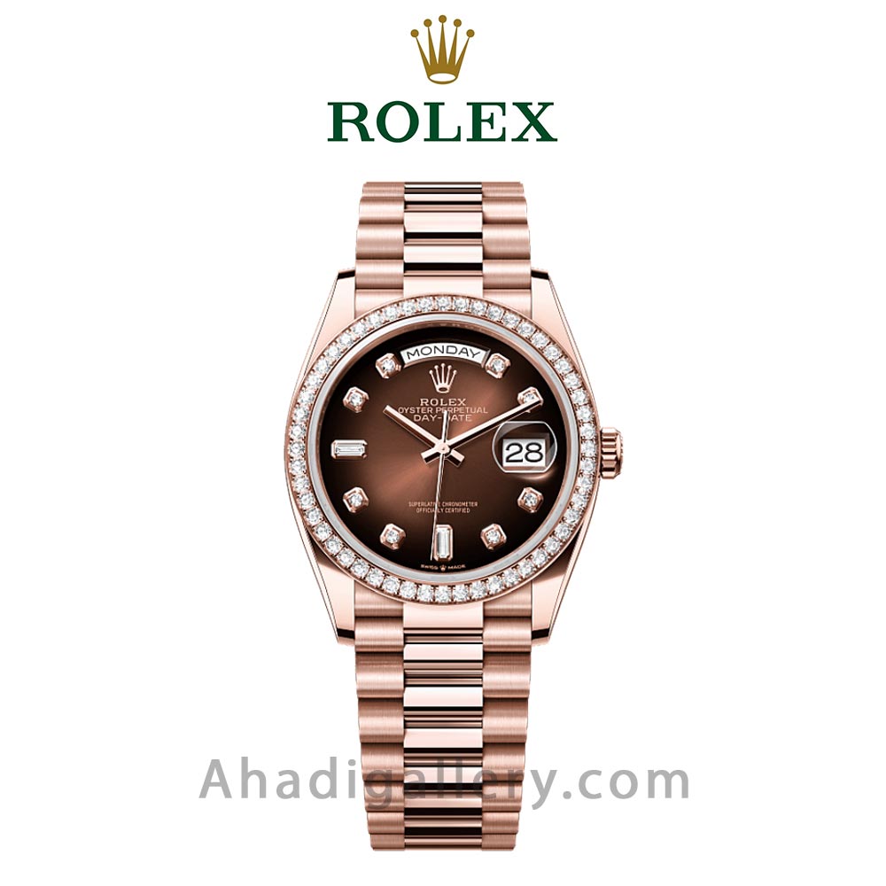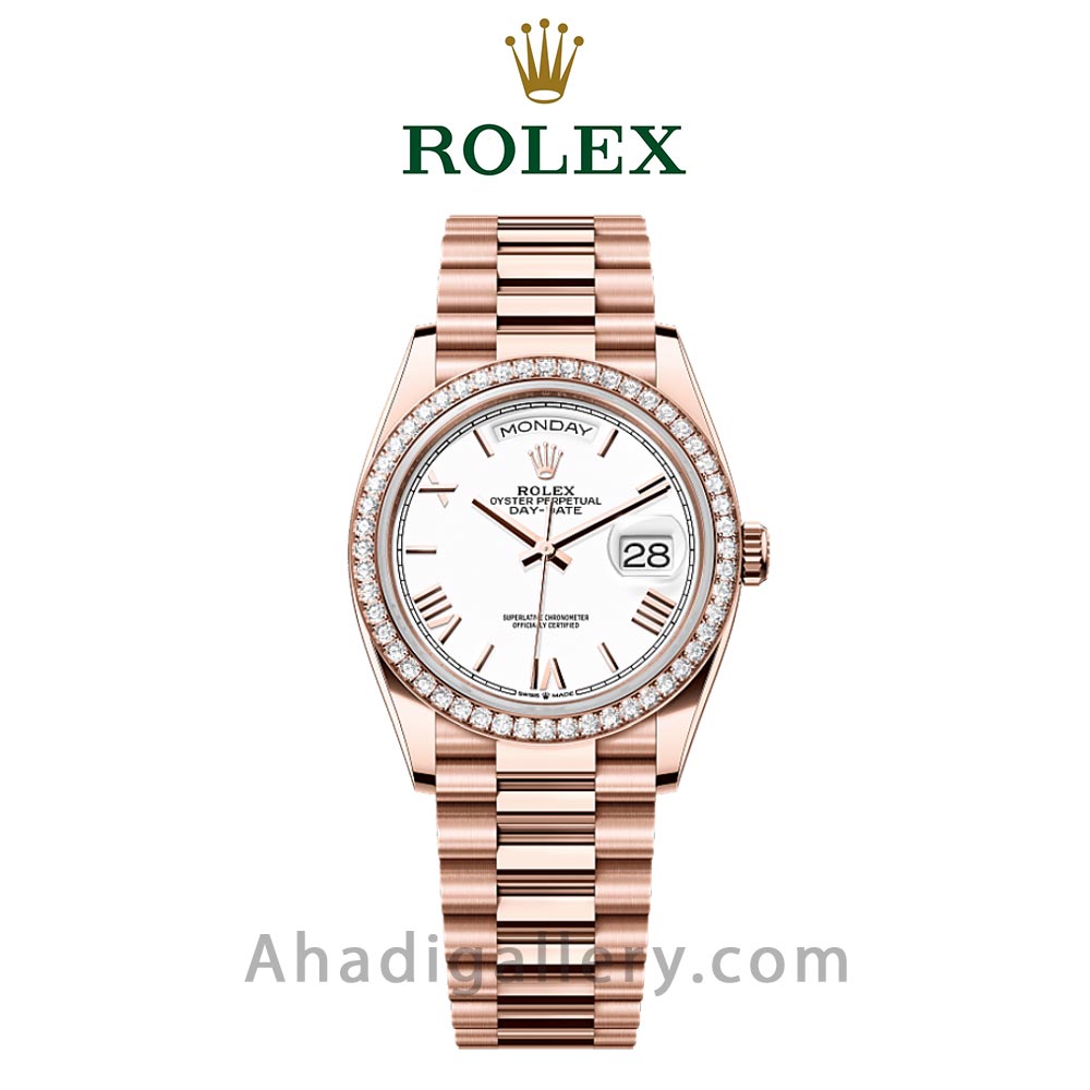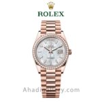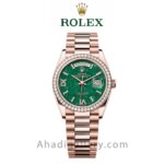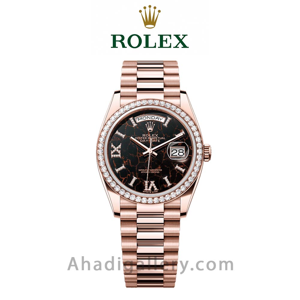 ساعت Lady-Datejust Oyster Perpetual از جنس طلای ِاوررُز ۱۸ عیار با دور قاب الماسنشان و بند پرزیدنت است.