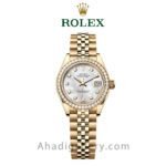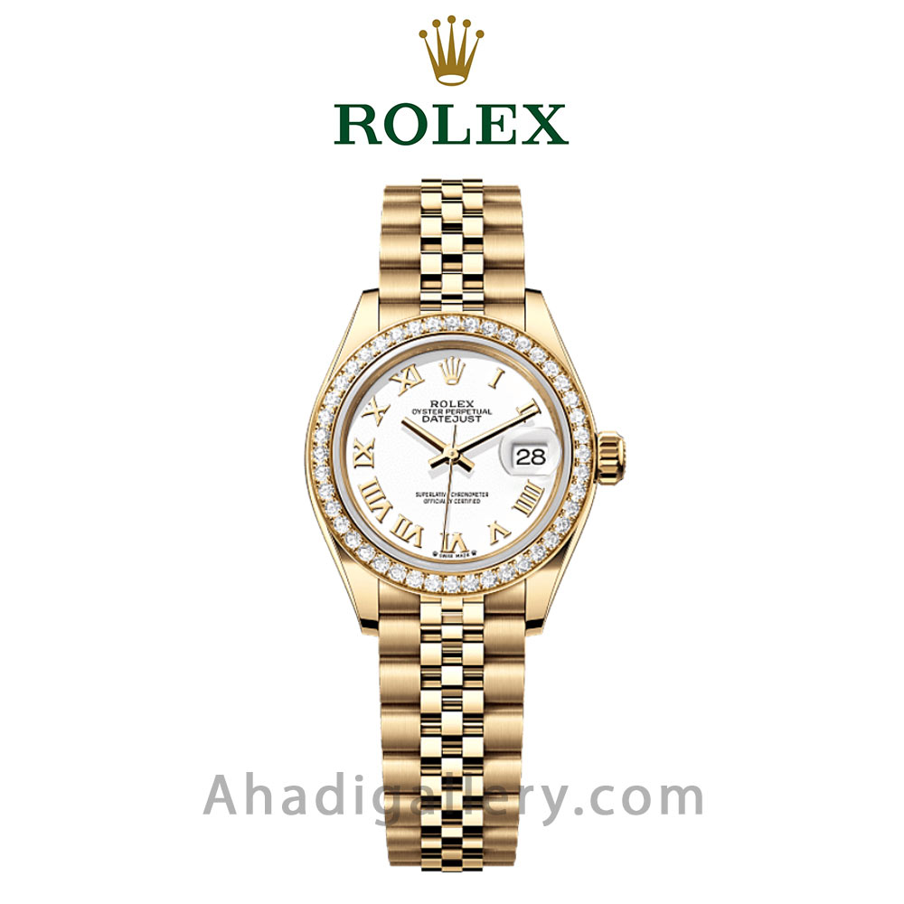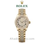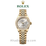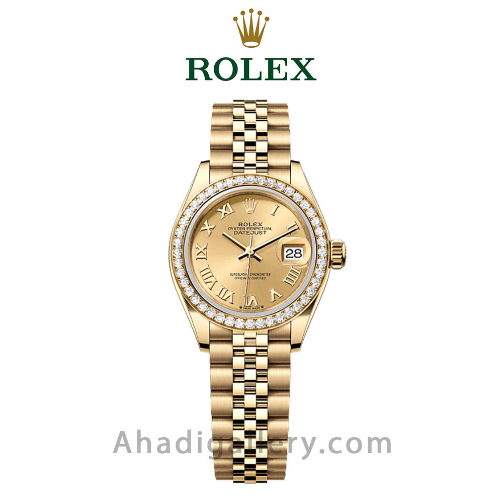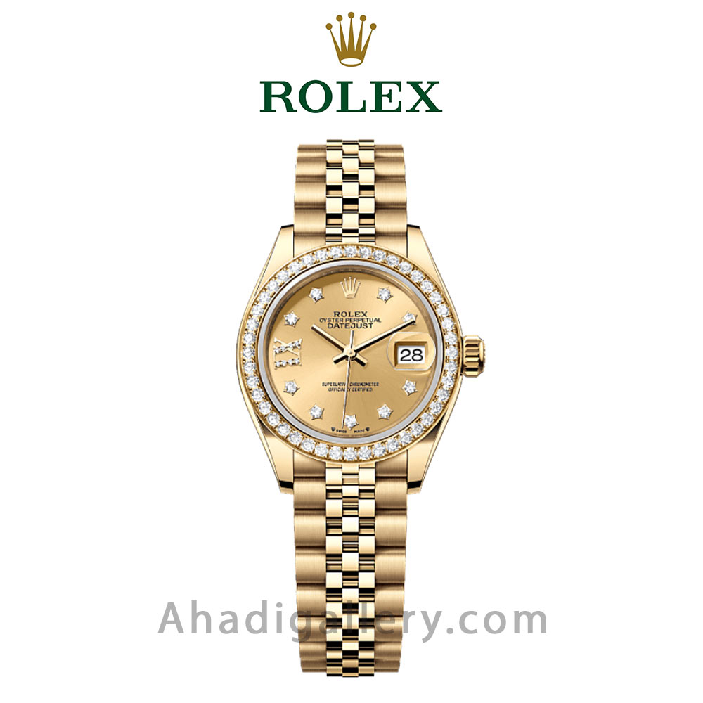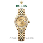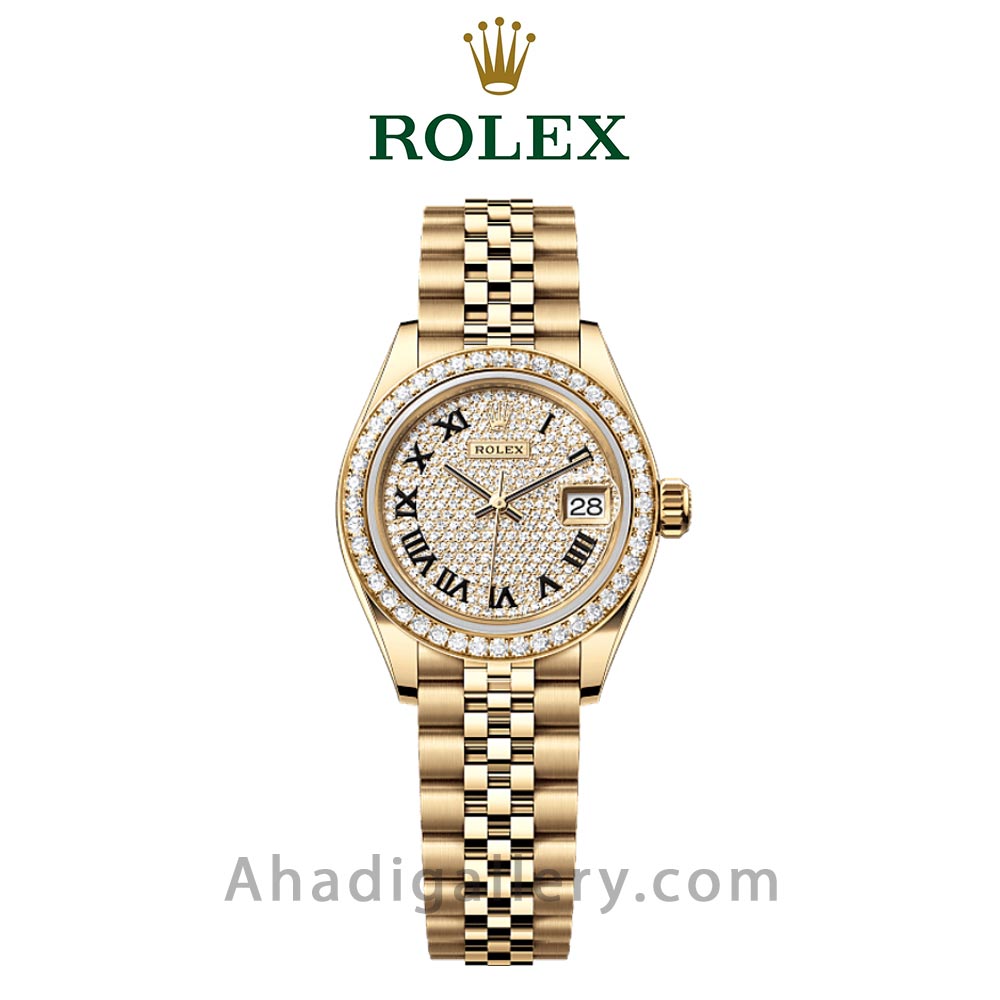 ساعت Lady-Datejust Oyster Perpetual از جنس طلای زرد 18 عیار، مجهز به صفحه الماسنشان و بند جوبیلی است.