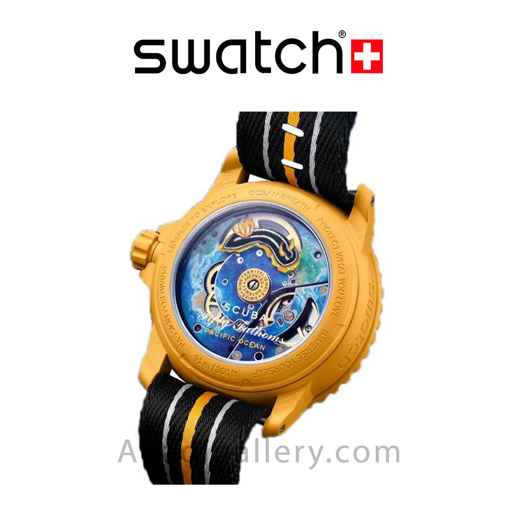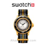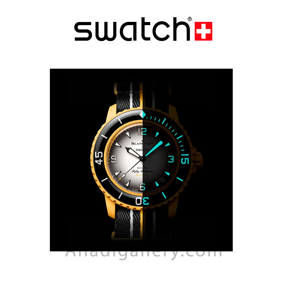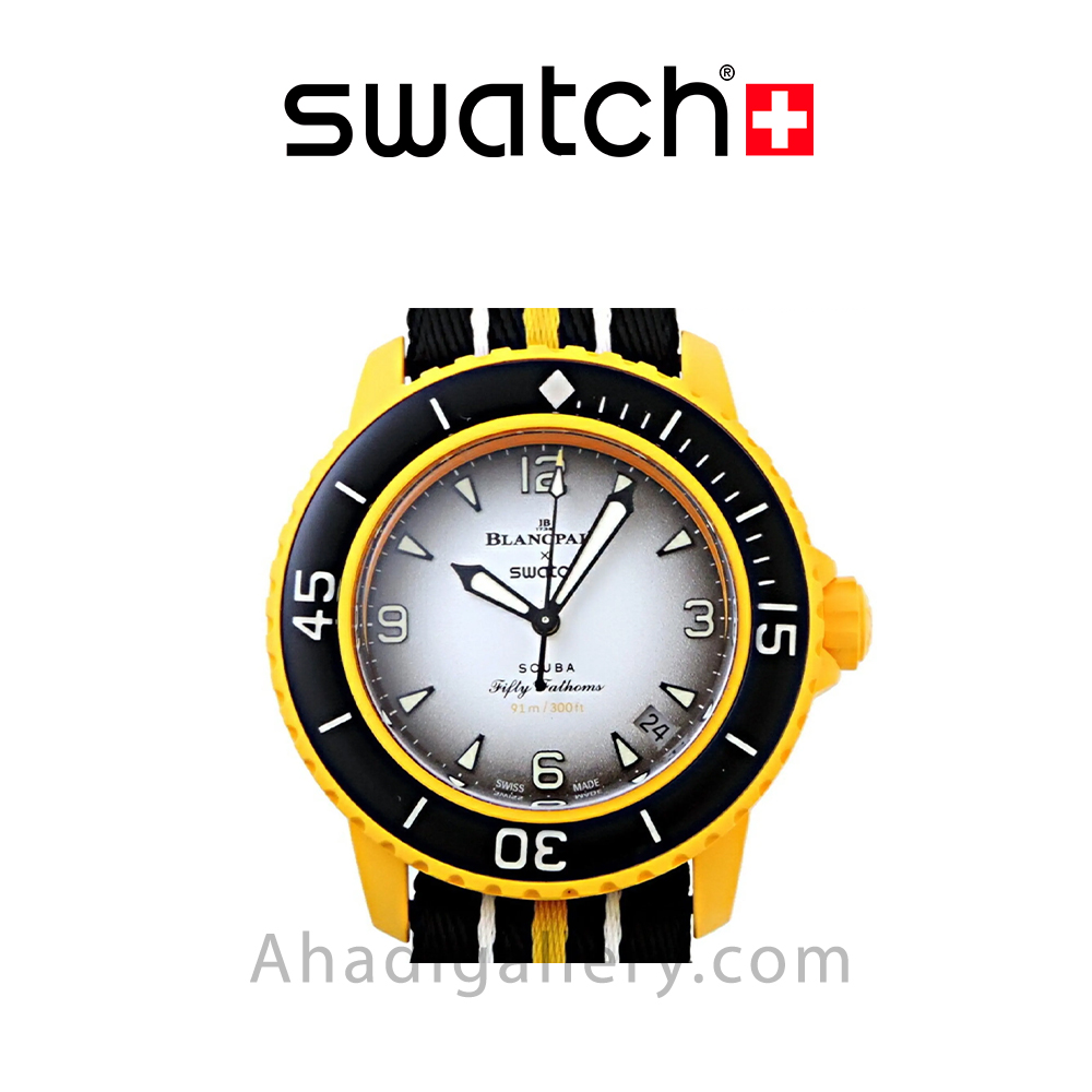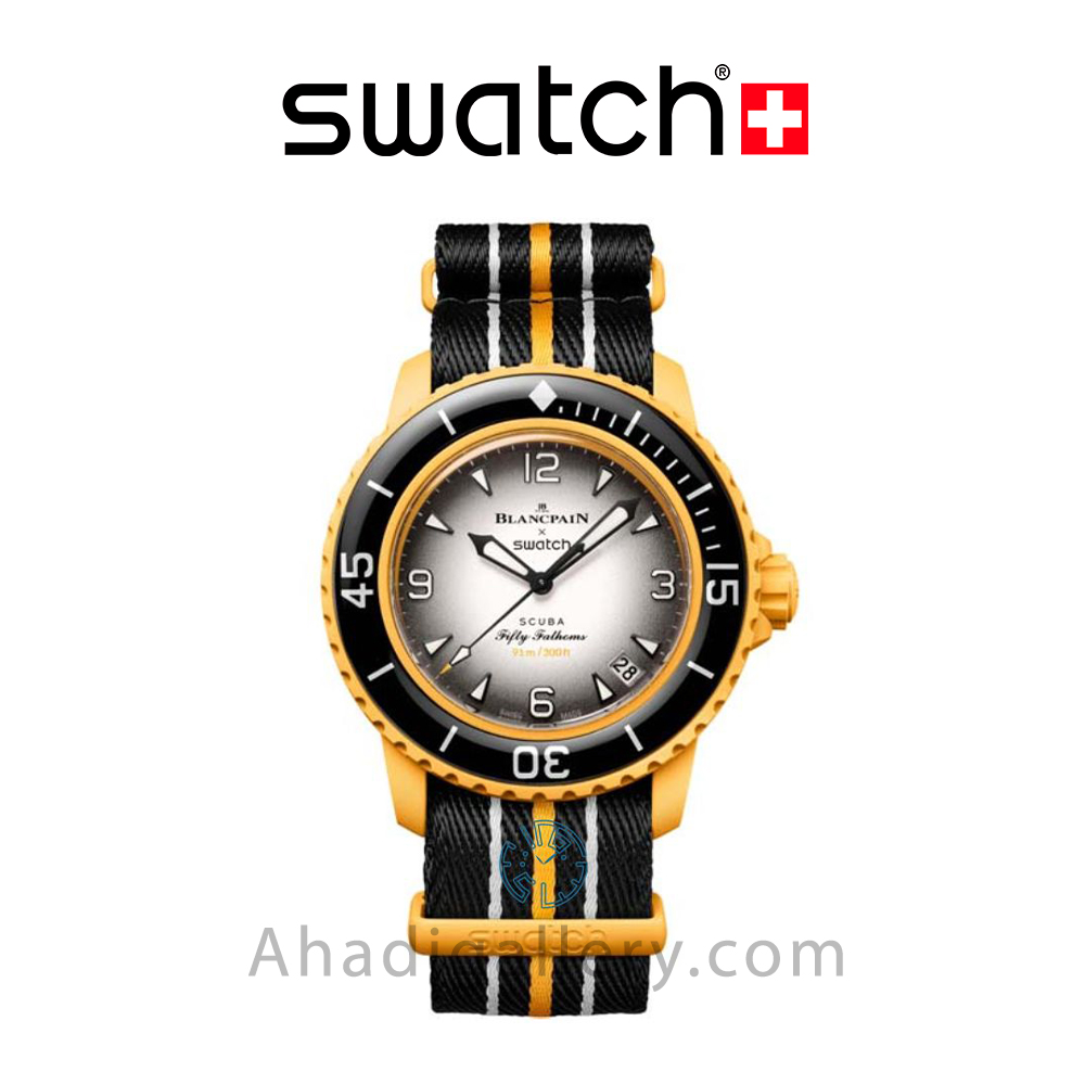ساعت Blancpain × Swatch SO35P100 از کالکشن مشترک Bioceramic Scuba Fifty Fathoms یک ساعت غواصی سبک و مدرن است.ساعت Blancpain × Swatch SO35P100 الهام گرفته از مدل کلاسیک غواصی Blancpain Fifty Fathoms است، که یکی از نمادینترین ساعتهای غواصی دنیا به حساب میآید. هدف طراحی این مدل، ترکیب استایل لوکس و حرفهای غواصی با متریال سبک و مدرن Bioceramic Swatch بوده تا هم حس کلاسیک و هم راحتی روزمره و محیطزیستی را ارائه دهn. قاب آن از Bioceramic ساخته شده و قطرش حدود ۴۲.۳ میلیمتر است. این مدل مجهز به موتور خودکار Sistem51 با حدود ۹۰ ساعت ذخیره انرژی است و مقاومت آب آن تا ۹۱ متر دارد، بنابراین برای شنا و فعالیتهای سبک آبی مناسب است. بزل گردان یکطرفه و شیشهی مقاوم در برابر خش، طراحی غواصی حرفهای به ساعت میدهد و بند NATO‑style از تورهای ماهیگیری بازیافتی سبک و راحت است. این ساعت برای کسانی مناسب است که دنبال ترکیبی از سبک مدرن Swatch، امکانات غواصی و طراحی دوستدار محیط زیست هستن