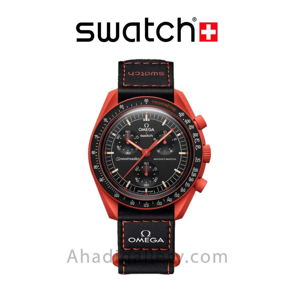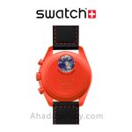 ساعت Swatch × Omega مدل Mission on Earth – Lava (SO33O100) مدلی جسور و چشمگیر از مجموعه MoonSwatch است که با الهام از گدازههای داغ زمین طراحی شده. قاب و دکمههای آن از Bioceramic سبک و مقاوم ساخته شده و با رنگ نارنجی آتشین، ظاهر بسیار شاخصی ایجاد میکند. صفحهی مشکی با عقربهها و جزئیات نارنجی، کنتراست بالایی دارد و زیرصفحههای کرنوگراف، طراحی آن را شبیه مدلهای حرفهای Speedmaster کردهاند. موتور ساعت کوارتز و مناسب استفاده روزمره است و عقربهها با Super-LumiNova در تاریکی میدرخشند. بند VELCRO هم سبک و راحت است. مقاومت آب ساعت ۳ بار است و برای استفاده روزمره مناسب است اما برای شنا توصیه نمیشود. در مجموع، این مدل انتخابی فوقالعاده برای کسانی است که ساعتی مدرن، پرانرژی، متفاوت و بسیار جذاب میخواهند