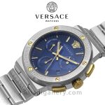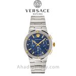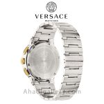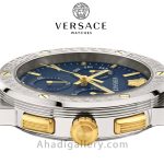 این ساعت سوئیسی یک اکسسوری شگفتانگیز و زیبا برای آقایان است، دارای یک صفحه 43 میلیمتری خیرهکننده با سه کرنوگراف و عقربههای باریک است. با الهام از اساطیر یونان با طراحی شیک و نوآورانه، لوگوی ورساچه به طور متناوب روی اطراف قاب تکرار می شود. صفحه به رنگ آبی و عقربه ها و شاخص ها طلایی است. قاب با پیچ های طلایی و بافت نمادین خودنمایی می کند. این مدل دارای 50 متر مقاومت در برابر آب است. می توان آن را برای مدتی در آب غوطه ور کرد، بنابراین می توان از آن برای شنا و ماهیگیری استفاده کرد. برای ورزش های آبی با تاثیر زیاد توصیه نمی شود.